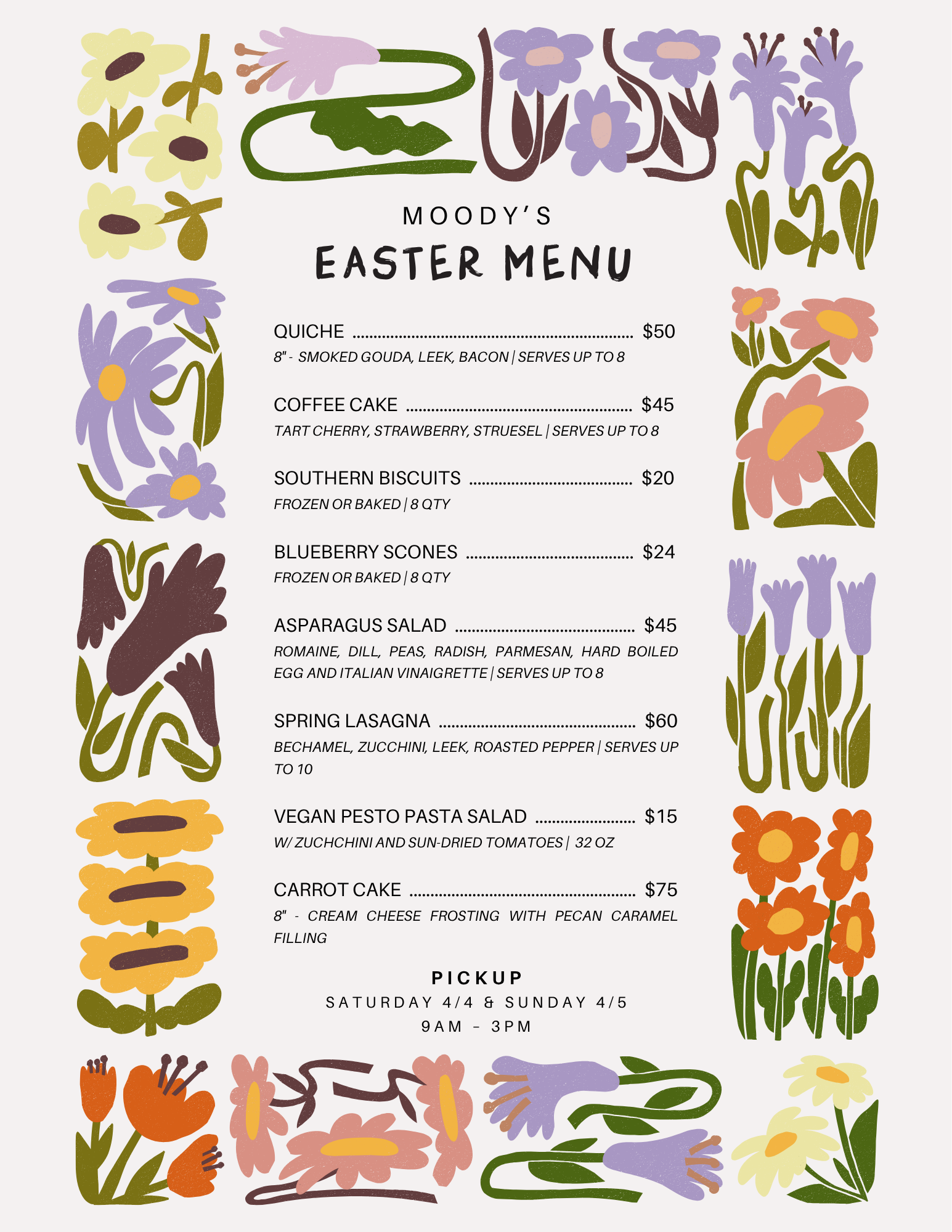 Please place all orders by Thursday, April 2nd. Email info@moodysmarket.com with any questions!